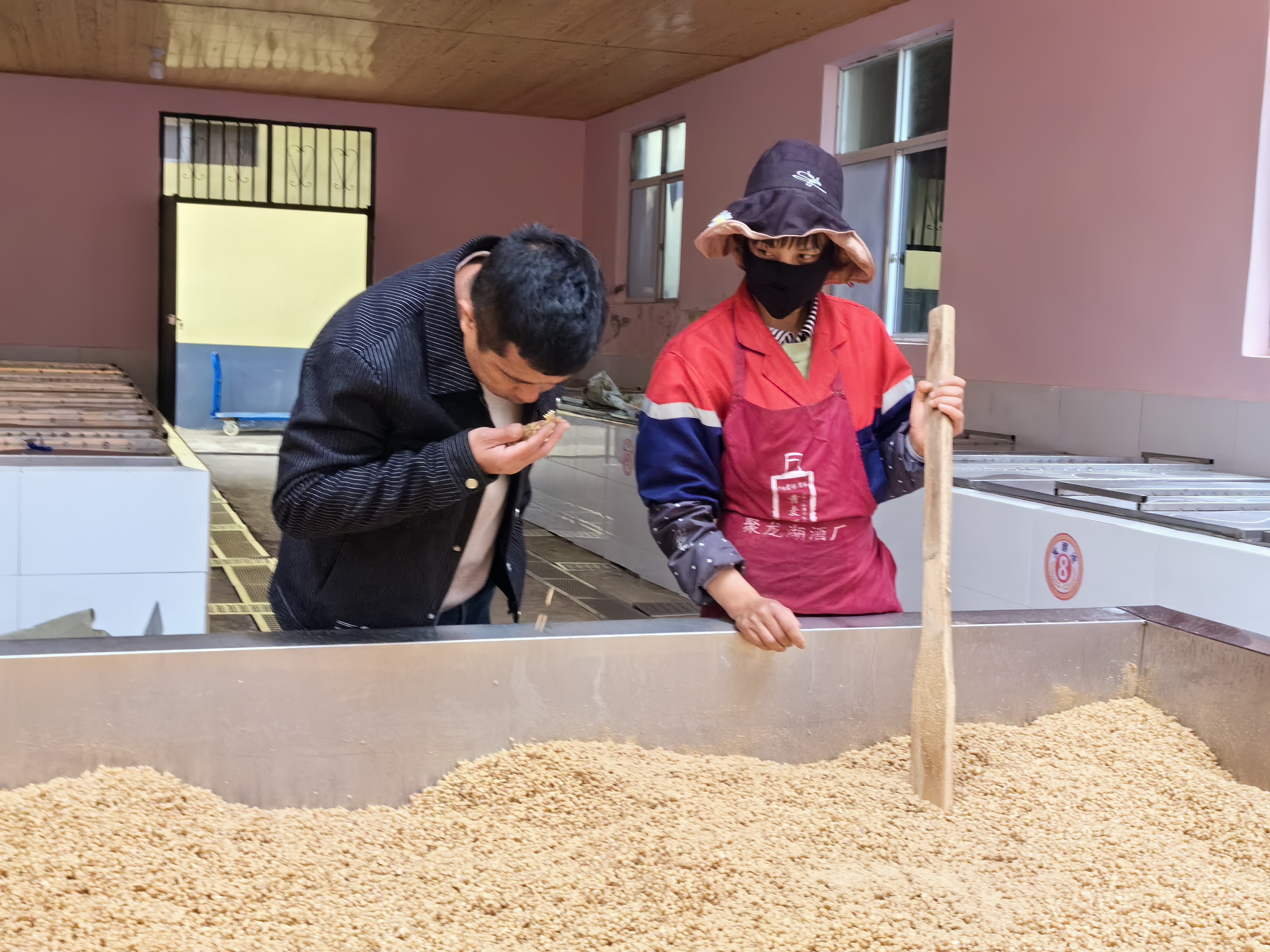 每天早晨,工人們按時(shí)來(lái)到維西尚良聚龍湖酒廠忙碌起來(lái),蒸糧、餾酒、灌裝……現(xiàn)場(chǎng)一派熱火朝天的景象。酒廠負(fù)責(zé)人施尚志奔走在各個(gè)生產(chǎn)車間,不時(shí)指導(dǎo)工人工作,叮囑工人注意安全。