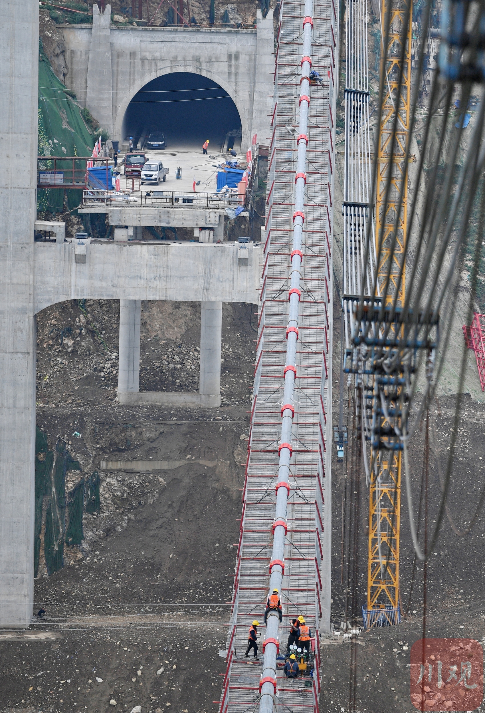 汶川縣境內(nèi)的國道317線友誼隧道至映秀段改建工程現(xiàn)場,施工人員在懸索橋主纜上作業(yè)。李向雨 攝