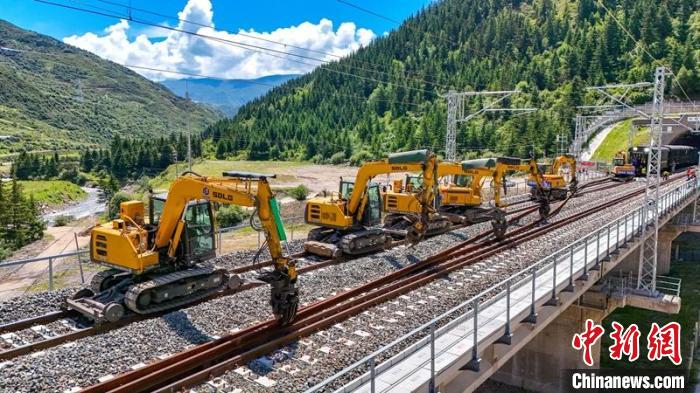 川青鐵路鎮(zhèn)黃段500米長軌鋪設(shè)采用“直鋪法”和“換鋪法”相結(jié)合的方式組織施工,無砟道床采取“直鋪法”施工,有砟道床采取“換鋪法”施工,利用工具軌鋪通右線,作為工程路料運(yùn)輸主線,同時(shí)兼顧左線鋪軌、長軌焊接鎖定及大機(jī)搗固穿插施工作業(yè)?!盀榇_保鋪軌安全有序推進(jìn),專門配置了HXN5型高原大功率內(nèi)燃機(jī)車等80余臺(輛)大型設(shè)備開展軌道施工作業(yè)。”張華稱,期間項(xiàng)目部合理分配資源,5天完成100公里長鋼軌鋪設(shè),12天完成100公里無縫線路單元焊接及放散鎖定工作。