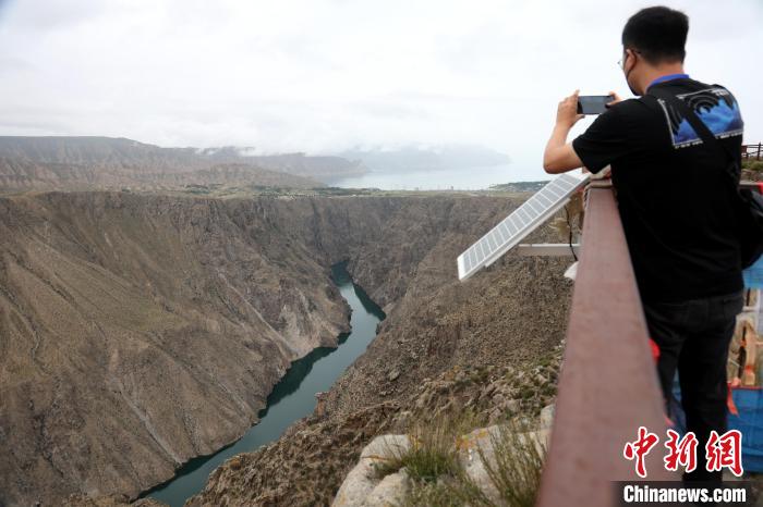 圖為網(wǎng)絡(luò)名人及媒體記者眺望龍羊峽水電站大壩。中新社記者 張?zhí)砀?攝