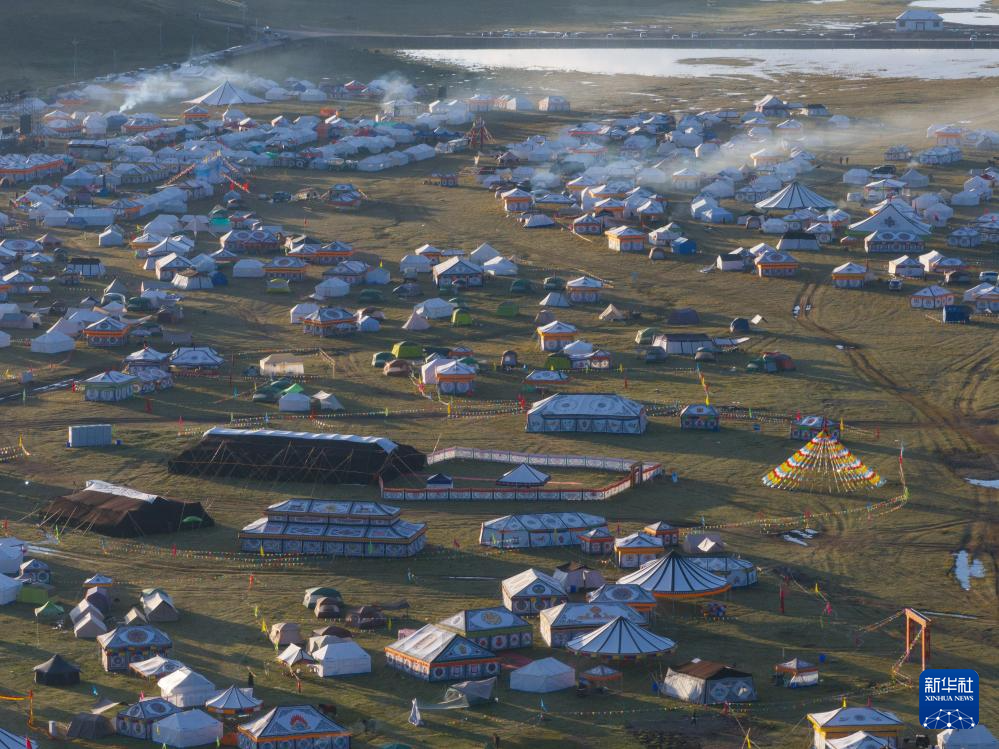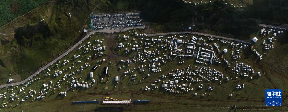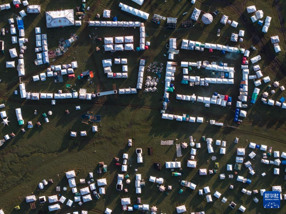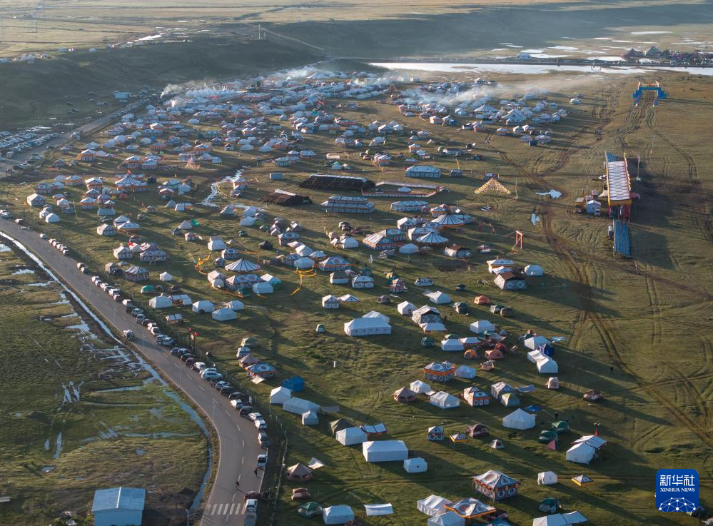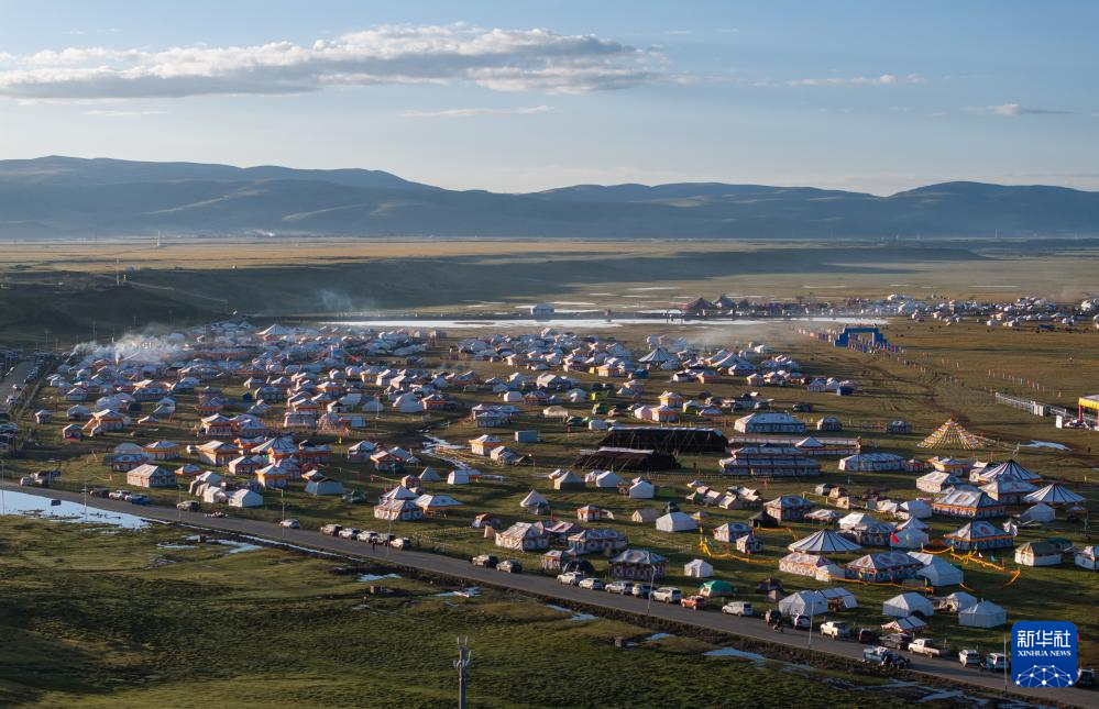在四川省甘孜藏族自治州理塘縣多旺塘拍攝的草原上的“帳篷城”(7月31日攝,無人機(jī)照片)。新華社記者 江宏景 攝
