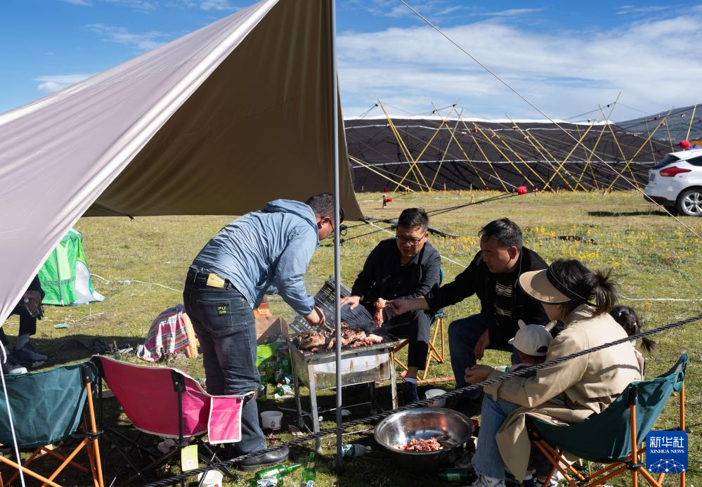 在四川省理塘縣多旺塘,當(dāng)?shù)厝罕娫诓菰现鹛炷缓蛶づ瘢?月31日攝)。新華社記者 江宏景 攝