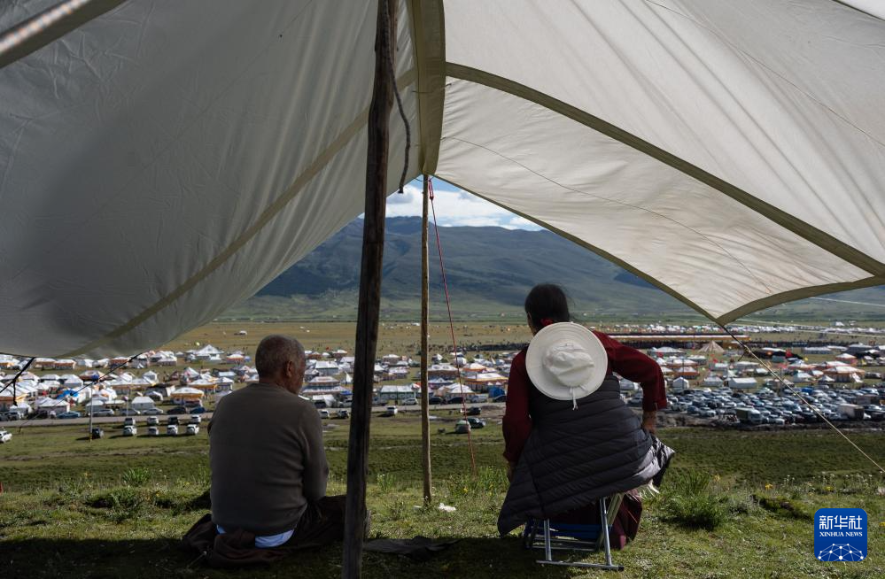 在四川省甘孜藏族自治州理塘縣多旺塘,兩位老人遠(yuǎn)眺比賽場(chǎng)地(7月31日攝)。新華社記者 江宏景 攝