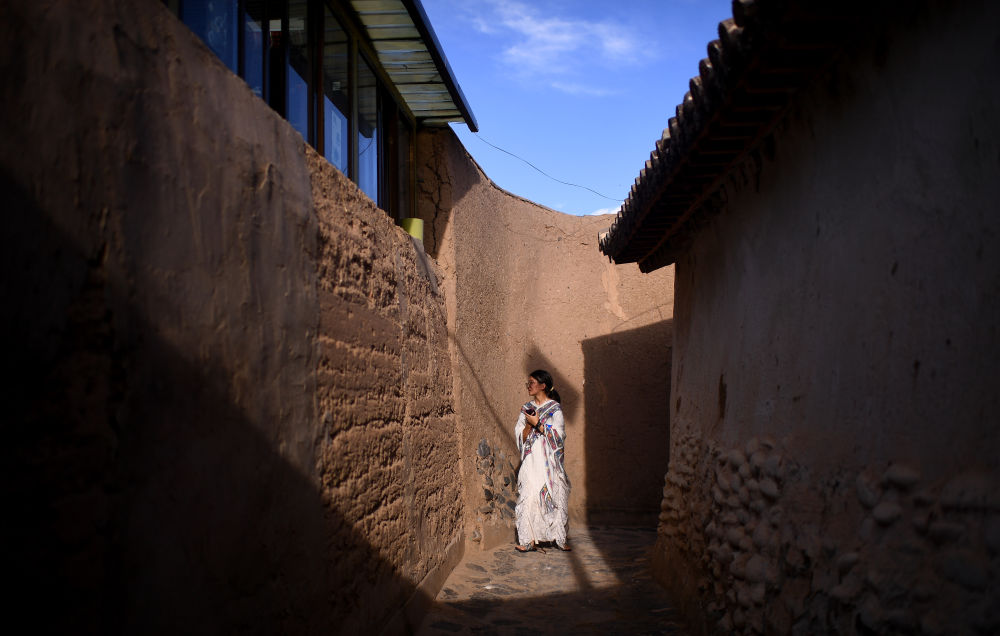 一名游客在同仁市郭麻日村郭麻日古堡內(nèi)游玩。新華社記者 張宏祥 攝