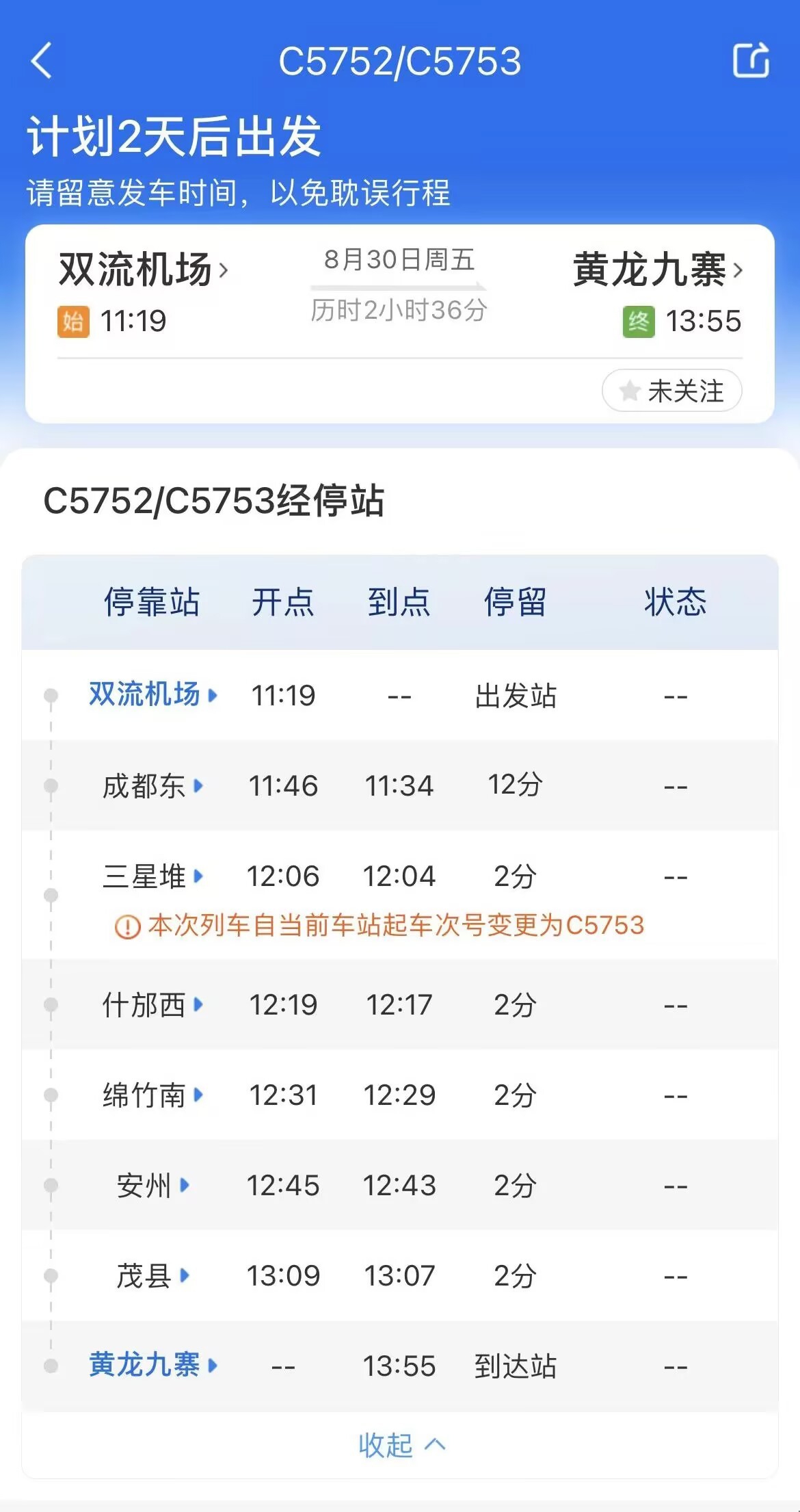 8月28日,記者從12306網(wǎng)站時刻表看到,目前四川成都至青海西寧鐵路鎮(zhèn)江關至黃勝關段車次信息已可以查詢,最近的發(fā)車時間為8月30日,成都至黃龍九寨動車用時在兩小時左右,這也意味著成都到黃龍景區(qū)、九寨溝景區(qū)的車程將大大縮短。