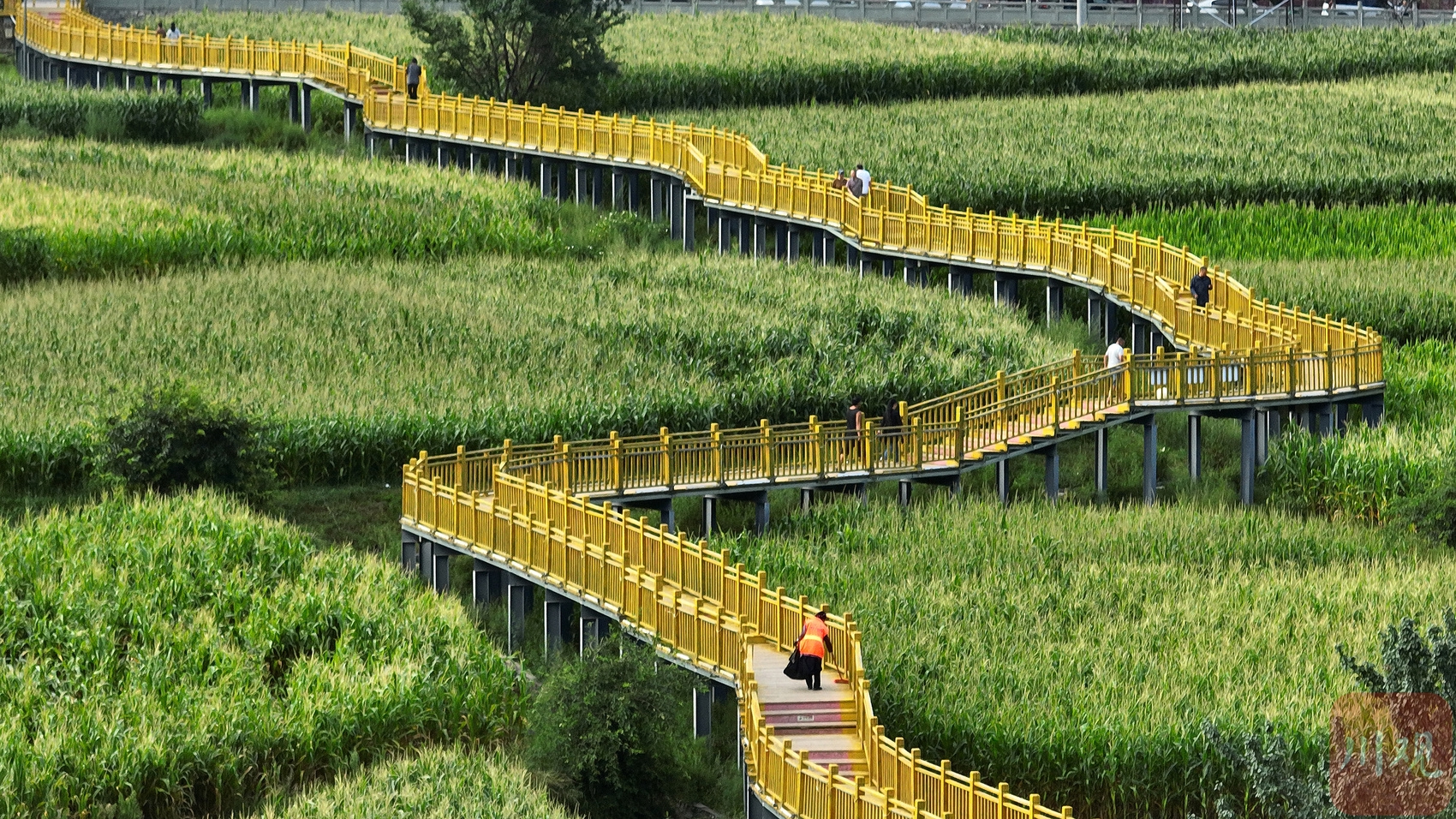28日晨,記者從住地步行到縣城邊的“田園棧道”,只用了10分鐘。此時(shí)晨光中天色已泛藍(lán),田地里懸空架起的棧道,從郁郁蔥蔥的玉米田里一直曲折延伸,從空中俯瞰如同黃色哈達(dá)纏繞在翠綠田間,此景讓人眼前一亮。