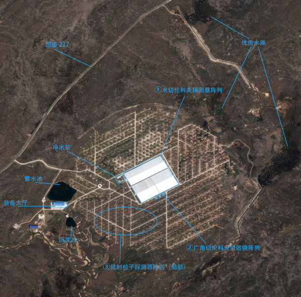“拉索”占地面積約1.36平方公里,由地面簇射粒子探測器陣列(包含5216個電磁粒子探測器和1188個繆子探測器)、水切倫科夫探測器陣列(面積約78000平方米)和廣角切倫科夫望遠鏡陣列(18臺)組成,采用四種探測技術(shù),可全方位、多變量測量來自高能天體的伽馬射線和宇宙線。
