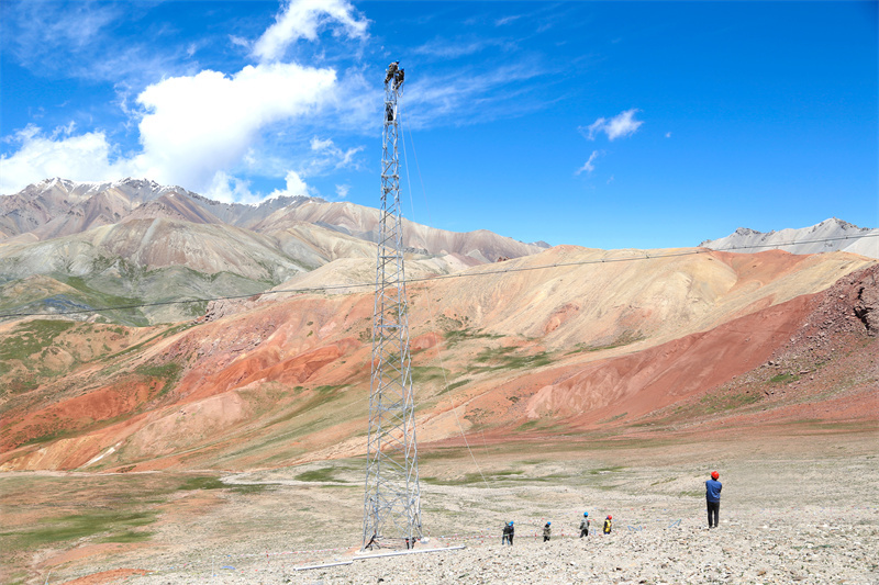 團結峰下,國網(wǎng)青海省電力公司輸電專業(yè)施工人員正在開展蘇里35千伏輸變電工程組塔安裝工作。許小萍 攝