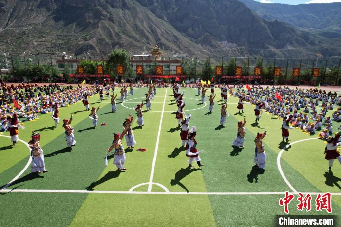 10月14日,德欽縣第二小學(xué)學(xué)生在足球場(chǎng)上跳集體鍋莊舞?!?德欽縣第二小學(xué)供圖)