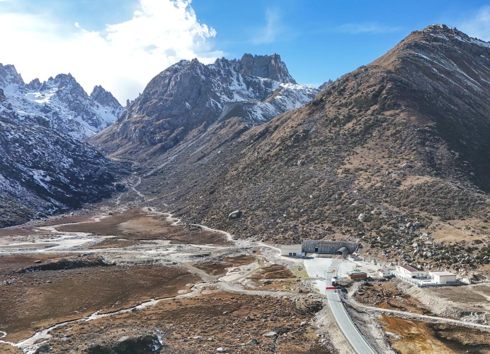 這是11月1日拍攝的317國道雀兒山隧道口(無人機(jī)照片)。新華社記者 王曦 攝