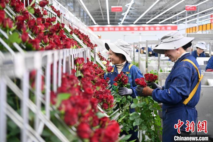 甘肅臨夏回族自治州臨夏市23日寒風(fēng)正勁。步入該市枹罕鎮(zhèn)青寺村的百益億農(nóng)國際鮮花港內(nèi),暖意正濃。引自荷蘭的多個(gè)品種玫瑰花競(jìng)相開放,它們即將被打包發(fā)往北京、上海、廣州,以及東南亞等地。