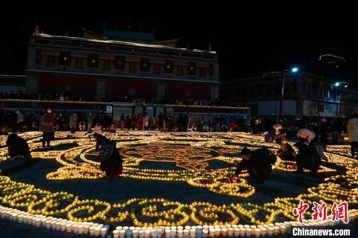 傍晚六時(shí)許,在塔爾寺標(biāo)志性建筑八寶如意塔周圍,僧眾在擺成各種圖案、藏漢字符的燈陣中小心翼翼穿行,用紙板圍擋住搖曳火光,蹲在地上一遍遍重新燃起被風(fēng)吹熄的點(diǎn)點(diǎn)火苗,口中默誦經(jīng)文,不少人環(huán)顧四周,高舉手機(jī),記錄殊勝時(shí)刻。