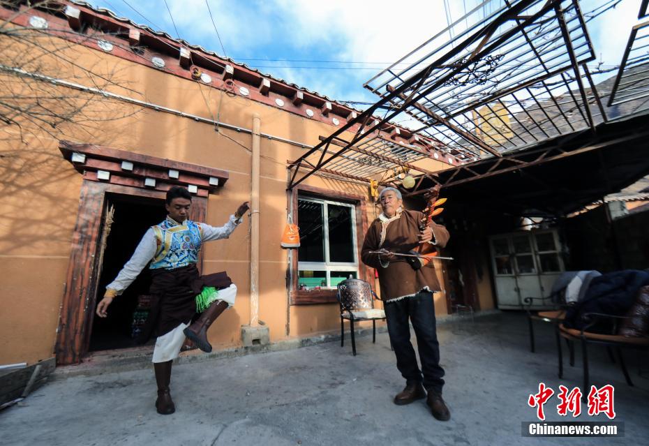 12月21日,四川巴塘,王扎西(右)在自家院中彈奏弦胡,學(xué)員降擁朗加在一旁跳起巴塘弦子舞。中新社記者 薛蒂 攝