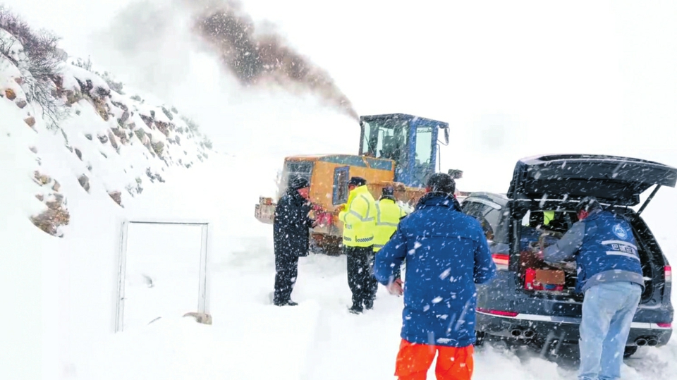 聯(lián)合多部門營救推土機鏟雪護送救援人員