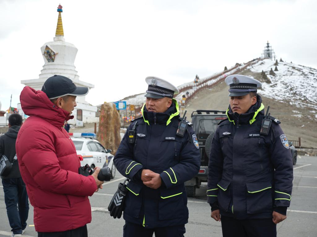 “‘二臺子’那個彎道背陰,冰還沒化,要把警車開到路上去提醒。‘老2885’彎急,要多注意?!巫印貎蓚€人,提醒車子一定不能占道停在路上!”四郎多吉在對講機里“排兵布陣”。