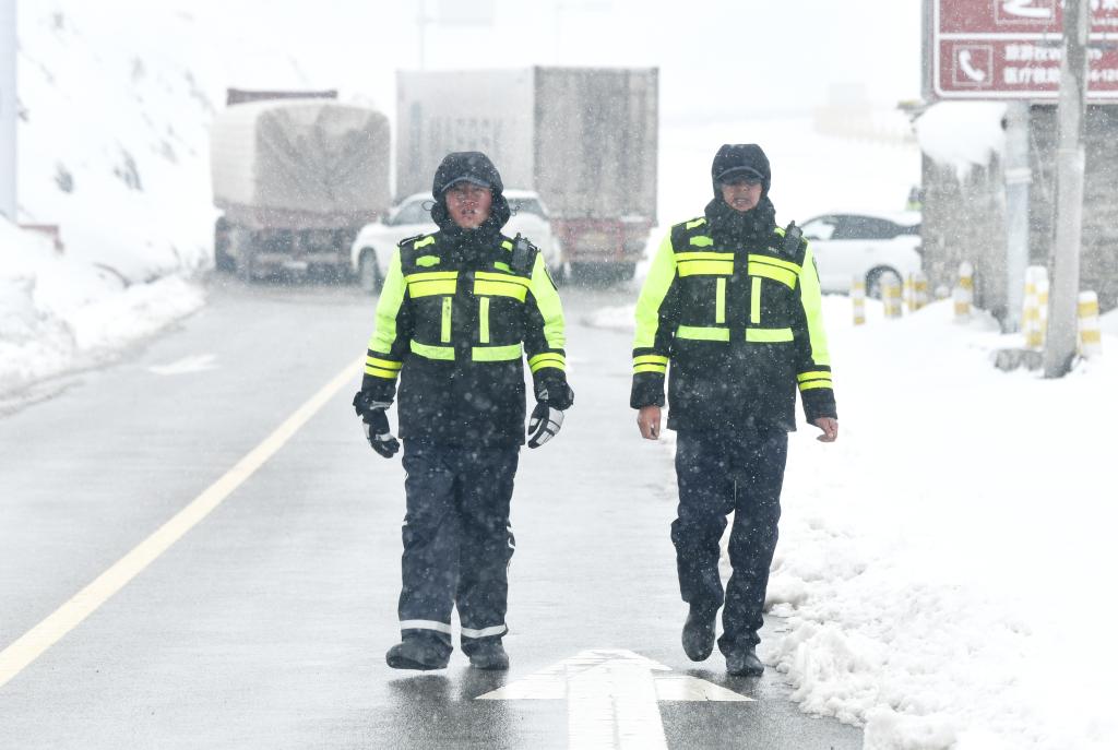 包永鵬(左)與王洛讓(右)在堵點執(zhí)勤。(甘孜公安供圖)