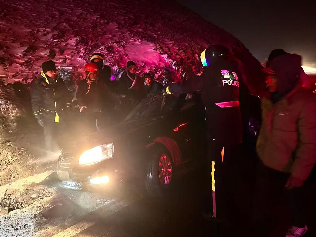 折多山警務(wù)站民輔警幫助側(cè)翻的私家車脫困。(甘孜公安供圖)