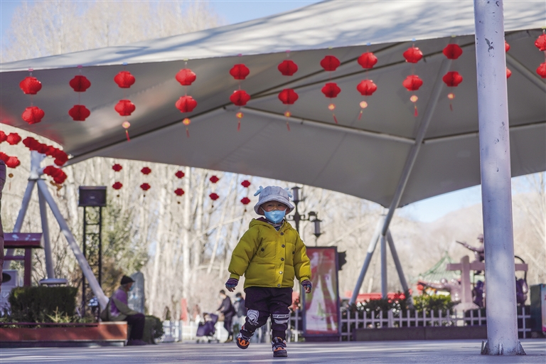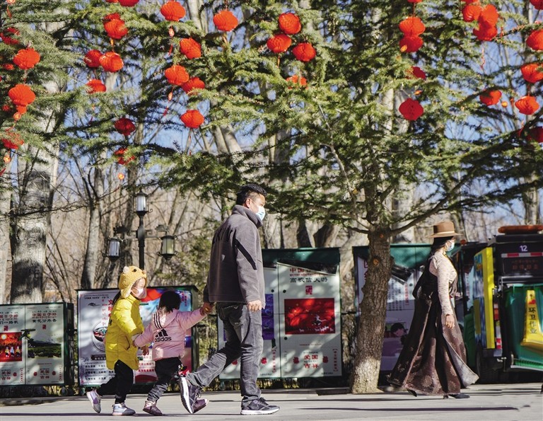 結(jié)束晨練的邊珍正在給紅燈籠下一蹦一跳玩耍的孫女拍照,“到處都掛滿了紅燈籠,把公園裝扮得格外喜慶,很有節(jié)日的氣息?!边呎湔f。
