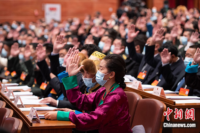 1月24日,西藏自治區(qū)第十一屆人民代表大會第四次會議上代表們舉手表決《西藏自治區(qū)國家生態(tài)文明高地建設(shè)條例(草案)》。中新社記者 何蓬磊 攝