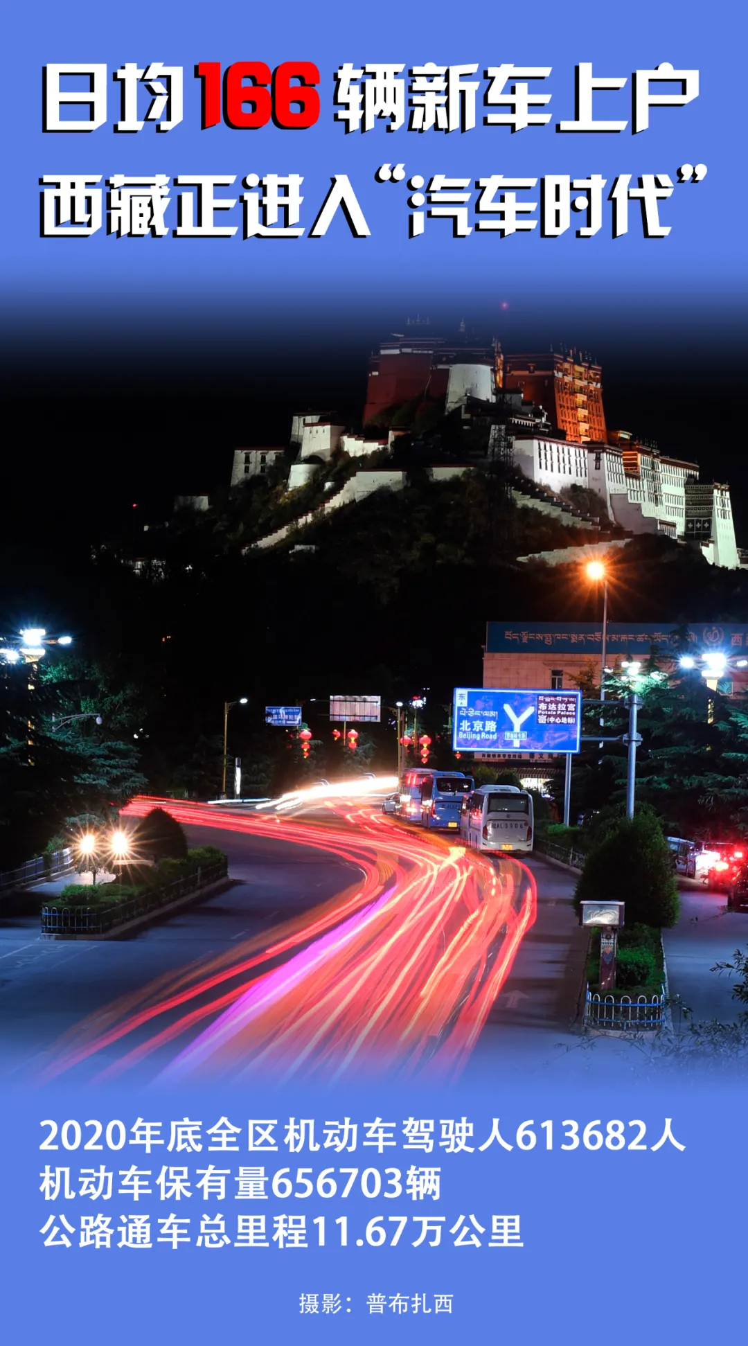 2020年,日均新車上戶166輛;截至當(dāng)年底,西藏機(jī)動(dòng)車保有量達(dá)到656703輛,機(jī)動(dòng)車駕駛?cè)诉_(dá)613682人。西藏公路通車總里程達(dá)到11.67萬公里。按照目前拉薩戶籍人口55萬人計(jì)算,基本上平均每兩個(gè)人就擁有一輛車。