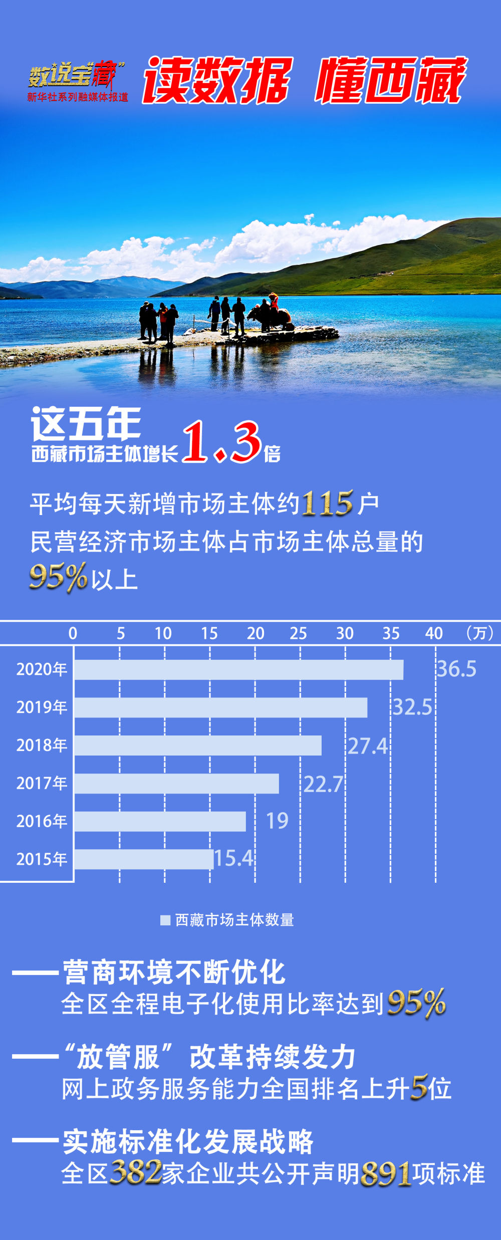 “十三五”期間,西藏市場(chǎng)主體活力不斷被激發(fā),群眾創(chuàng)業(yè)辦事便利度、滿意度顯著提升。西藏自治區(qū)政府統(tǒng)計(jì)數(shù)據(jù)顯示,目前西藏市場(chǎng)主體數(shù)量已達(dá)36.5萬(wàn)戶,較“十二五”末增長(zhǎng)了1.3倍,5年來(lái)平均每天新增市場(chǎng)主體約115戶。
