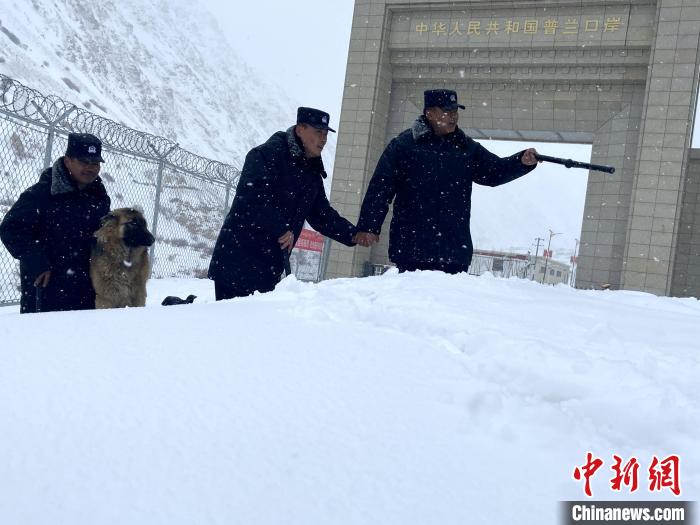 圖為在積雪中守衛(wèi)國門的普蘭邊檢站民警?!∑仗m邊檢站供圖