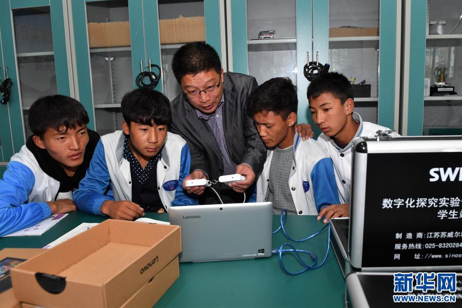在西藏日喀則市第一高級中學(xué),來自山東省煙臺市海陽四中的物理老師魯旭(中)在指導(dǎo)高三學(xué)生進(jìn)行物理課分組實驗(2017年8月23日攝)。新華社記者 張汝鋒 攝