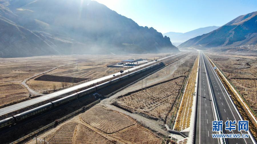 這是拉薩至那曲高等級(jí)公路(右)和青藏鐵路沿線風(fēng)光(1月28日攝,無人機(jī)照片)。新華社記者 晉美多吉 攝