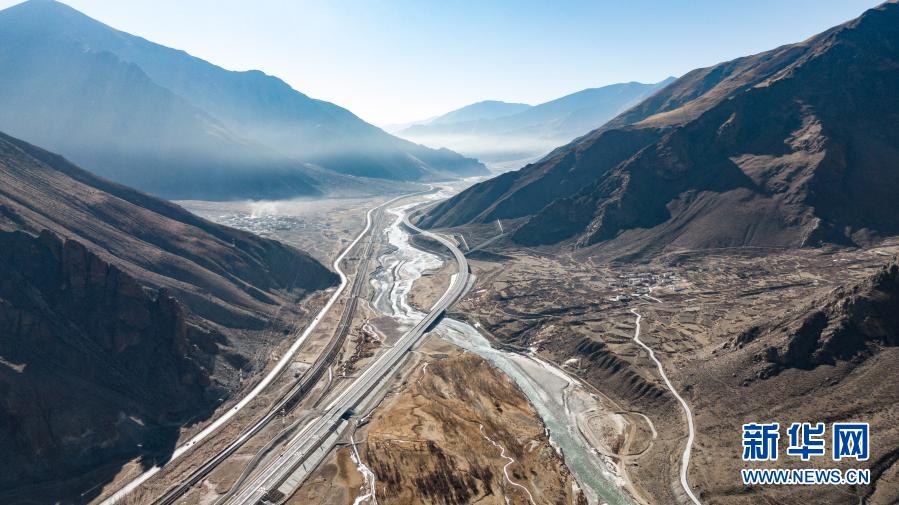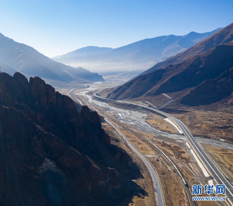 這是拉薩至那曲間的交通線路(1月28日攝,無人機(jī)照片)。從左到右依次為109國道、青藏鐵路、高等級(jí)公路。新華社記者 孫非 攝