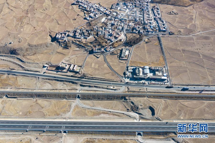 這是拉薩至那曲高等級(jí)公路(下)和青藏鐵路沿線村莊(1月28日攝,無人機(jī)照片)。新華社記者 孫非 攝