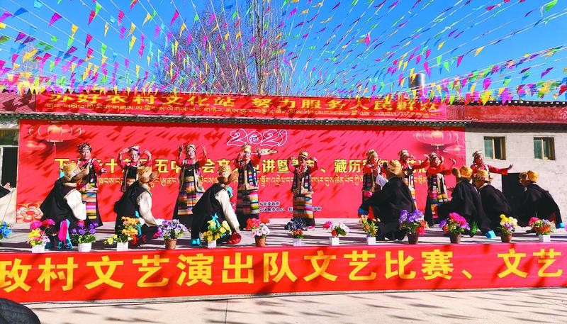 圖為瓊結(jié)縣下水鄉(xiāng)各行政村文藝演出隊演職人員在組織開展春節(jié)、藏歷新年文藝演出活動。
