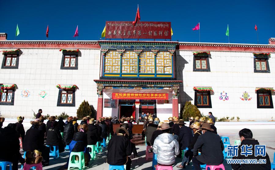 2月9日,西藏自治區(qū)供銷合作社社有企業(yè)——西藏領(lǐng)峰田舍益家公司負(fù)責(zé)人趙全(左一)給當(dāng)?shù)厝罕姲l(fā)放分紅。新華社記者 普布扎西 攝