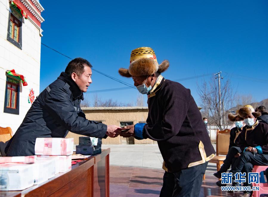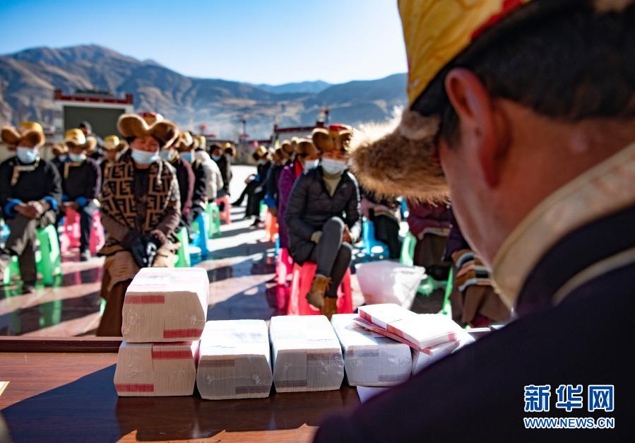 2月9日,在西藏民主改革第一村——山南市乃東區(qū)克松村社區(qū),農(nóng)民依次領(lǐng)取嶄新的百元鈔票,為即將到來(lái)的藏歷新年增添了喜慶的氛圍。新華社記者 普布扎西 攝
