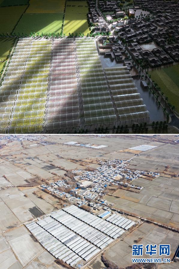 拼版照片:上圖是西藏山南市乃東區(qū)克松村社區(qū)農(nóng)業(yè)產(chǎn)業(yè)生產(chǎn)基地規(guī)劃圖(2月9日攝);下圖是克松村社區(qū)農(nóng)業(yè)產(chǎn)業(yè)生產(chǎn)基地(2月9日攝,無(wú)人機(jī)照片)。新華社記者 普布扎西 攝