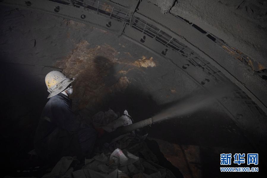 2月10日,在派墨公路老虎嘴隧道出口端,工作人員在進行掛網噴混凝土作業(yè)。新華社記者 孫非 攝