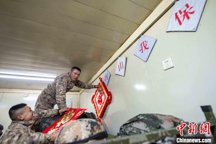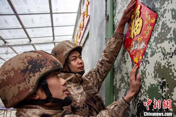 執(zhí)勤點(diǎn)上的官兵們,用“?!弊?、中國結(jié)將保溫方艙精心點(diǎn)綴裝飾,把祝福和期許默默留在心間。“一家不圓,萬家團(tuán)圓?!瘪R雪建是官兵中唯一的零零后戰(zhàn)士,他表示:“一身戎裝接過送來的‘?!郑闶强赶铝思缟系氖姑c責(zé)任,戰(zhàn)位上的新年就是邊關(guān)軍人的守望。”