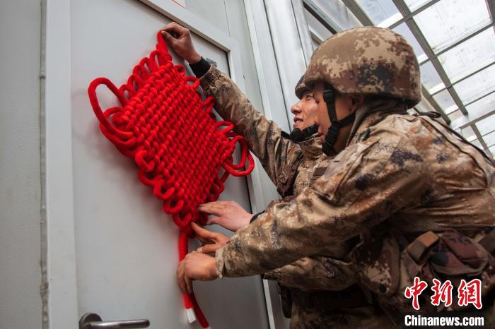該旅官兵正在用中國結(jié)點(diǎn)綴裝飾保溫方艙?!⊥跏鰱| 攝