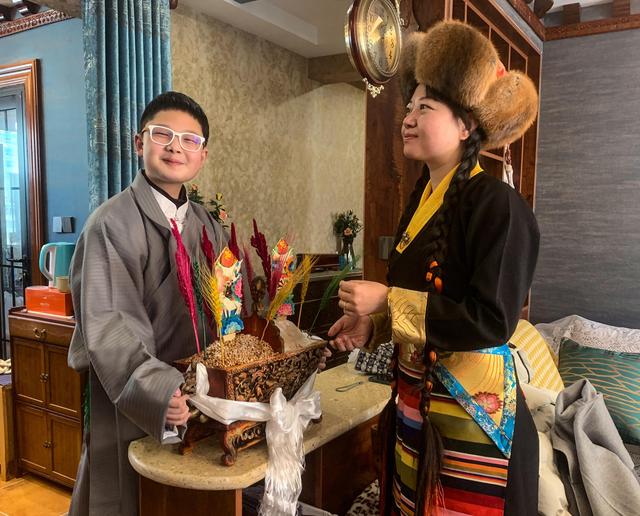2月12日,在西藏拉薩,達(dá)娃的漢族媳婦丁女士(右)吃切瑪,過(guò)新年。新華社發(fā)(達(dá)娃 攝)