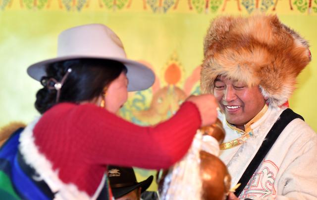 2月12日,拉薩市當(dāng)雄縣牧民互相敬獻(xiàn)青稞酒。新華社記者 覺(jué)果 攝
