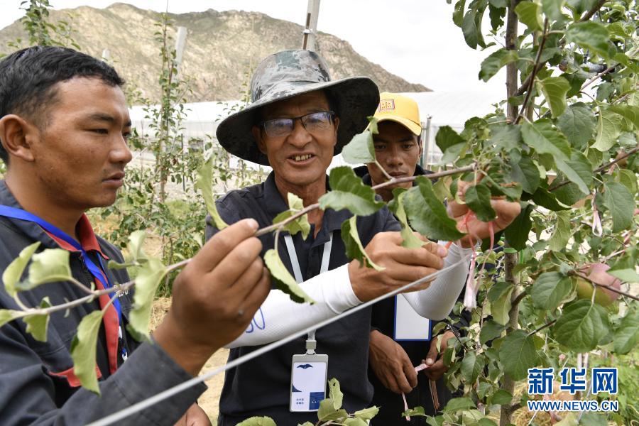 一名技術(shù)人員(中)在指導(dǎo)山南市貢嘎縣森布日村村民管理蘋果樹(2020年7月29日攝)。新華社記者 張汝鋒 攝