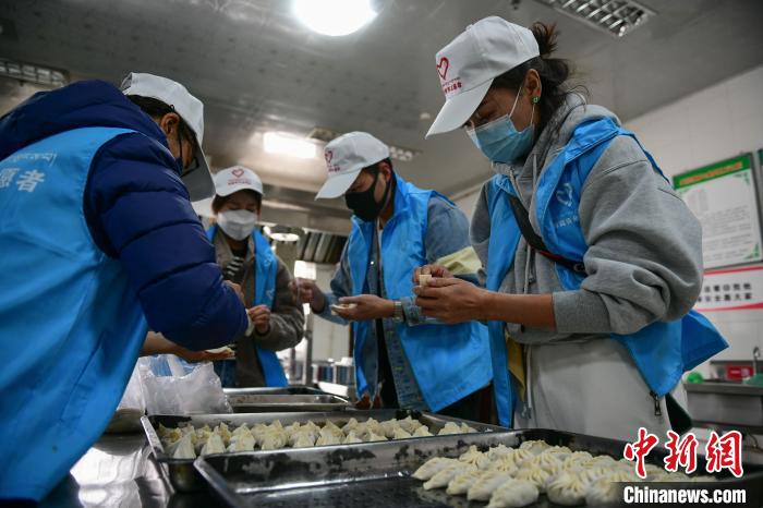 圖為青年志愿者在為福利院老人包餃子。 貢嘎來松 攝