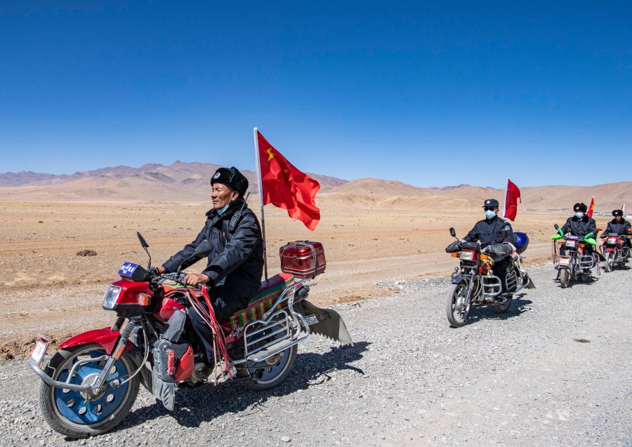 西藏日喀則市薩嘎縣昌果鄉(xiāng)的一處村莊里,48歲的藏族漢子石覺塔布在風中跨上一輛摩托車,向平坦無垠的高原邊緣騎去。他的車尾插著一面五星紅旗,被風吹得獵獵作響,即便駛出很遠,那抹紅色在車輪卷起的煙塵中也依然醒目。