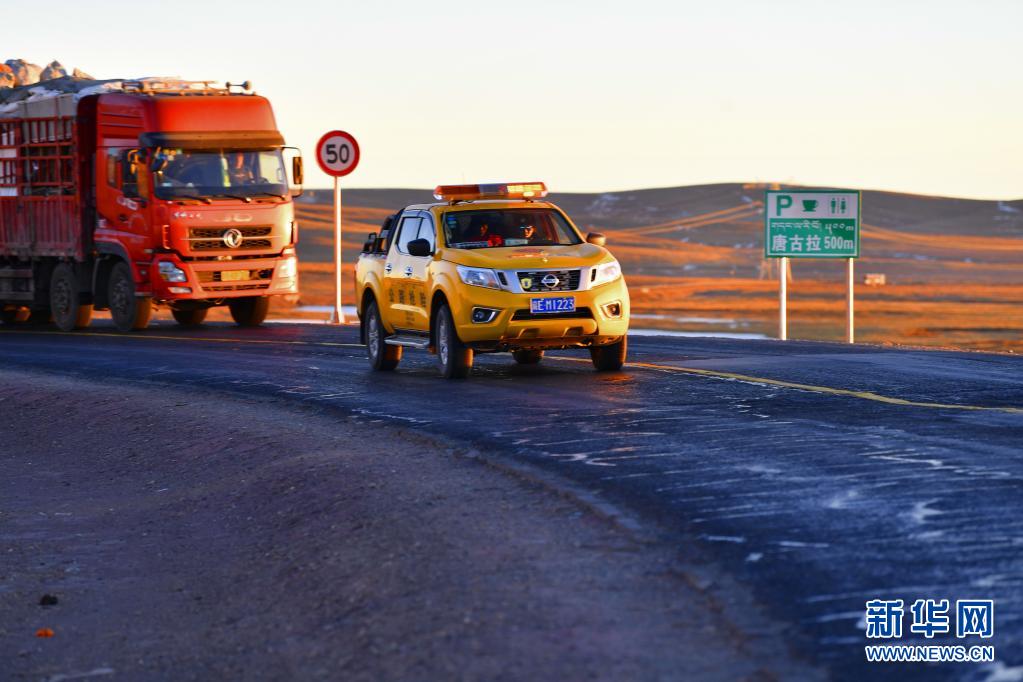 安多公路養(yǎng)護(hù)段工作人員在國(guó)道109唐古拉山口路段巡查(1月13日攝)。新華社記者 張汝鋒 攝