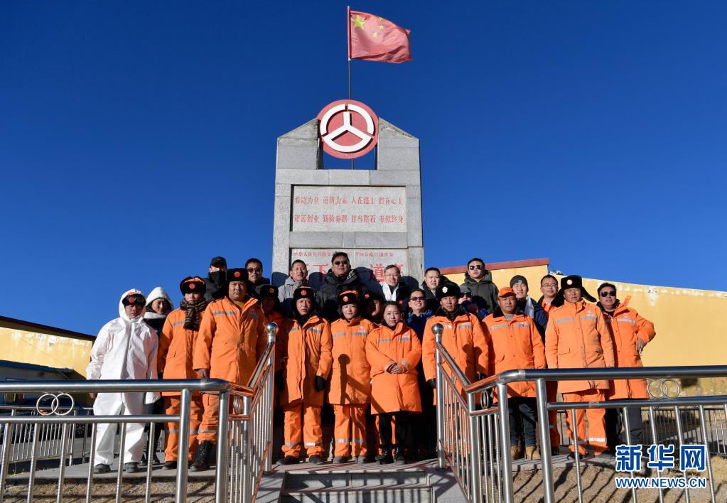 國(guó)道109線K3349路段應(yīng)急便道施工隊(duì)的工作人員(前排)和來(lái)訪者合影(1月13日攝)。新華社記者 張汝鋒 攝