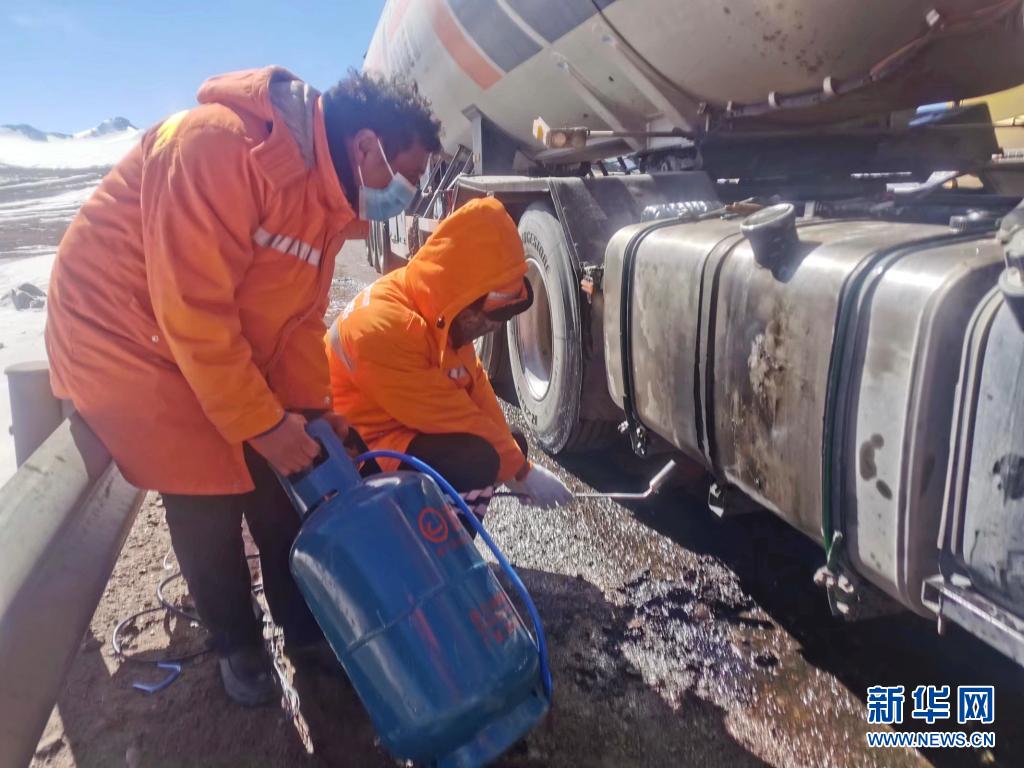 安多公路養(yǎng)護(hù)段工作人員幫助搶修故障車(2019年2月8日攝)。新華社發(fā)(后耀軍 攝)