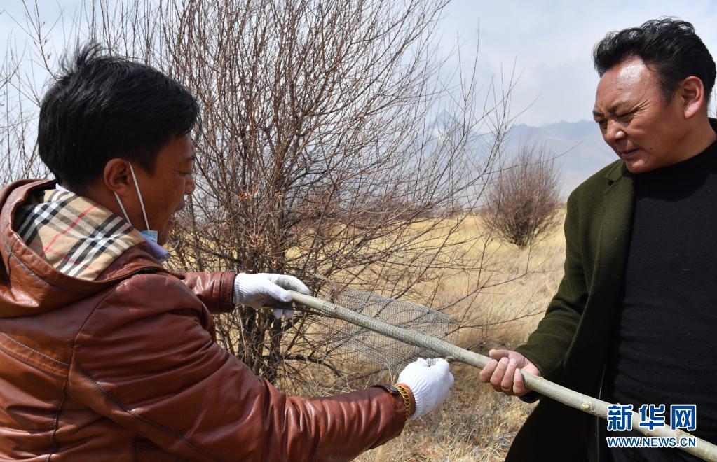 3月30日,索朗羅布(右)給樹(shù)裝上“防鼠套”。新華社記者 覺(jué)果 攝