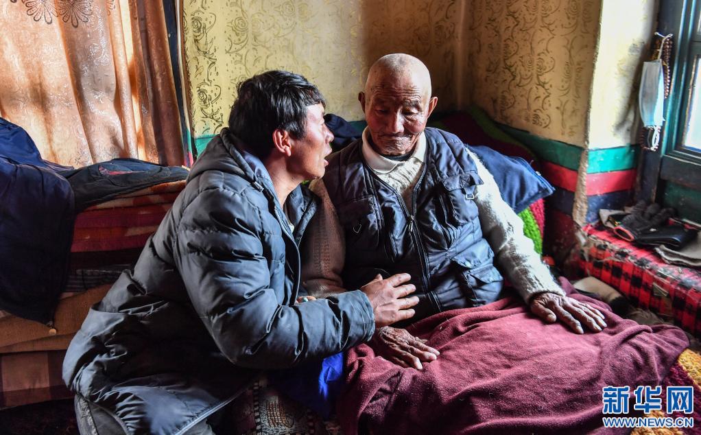 次培老人(右)和女婿聊天(3月22日攝)。新華社記者 晉美多吉 攝