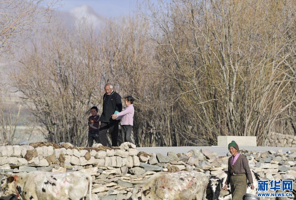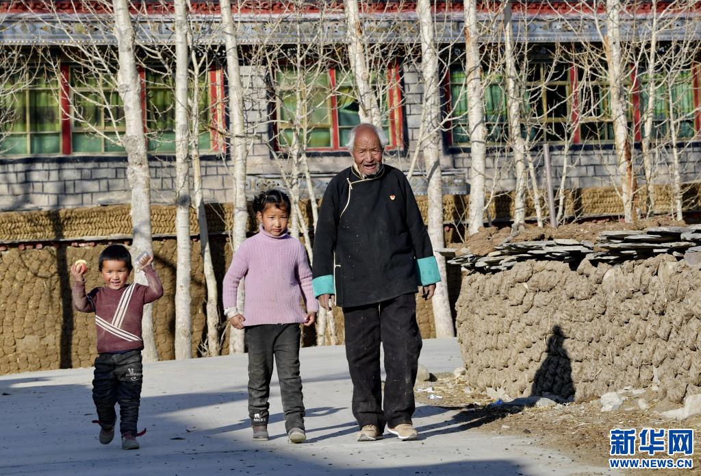 達(dá)國杰和孫子孫女在村子里散步(3月22日攝)。新華社記者 張汝鋒 攝
