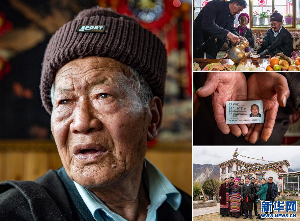 這是一張拼版照片,左圖為達(dá)確的肖像(1月14日新華社記者普布扎西攝);右上圖為家人給達(dá)確老人唱歌敬酒(1月14日新華社記者普布扎西攝);右中圖為達(dá)確的身份證(1月14日新華社記者晉美多吉攝);右下圖為達(dá)確(中)一家人的合影(1月14日新華社記者晉美多吉攝)。新華社發(fā)