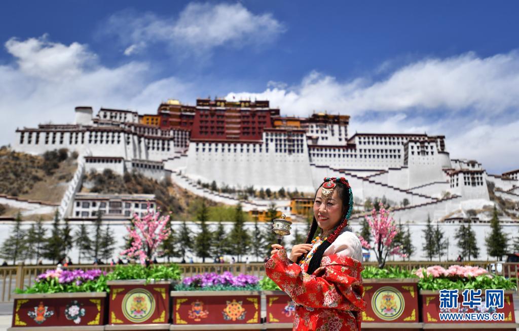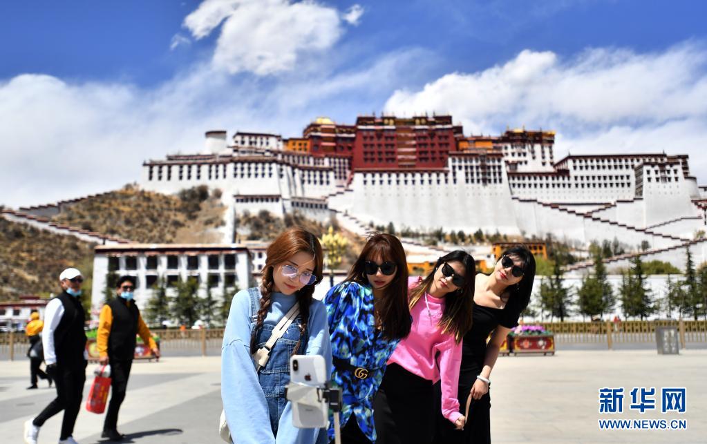 4月23日,來自重慶的游客在布達(dá)拉宮廣場(chǎng)留影。新華社記者 覺果 攝